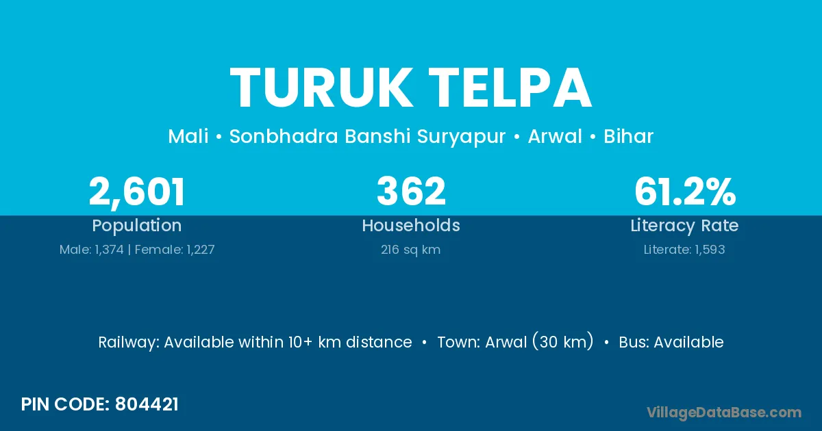 Arwal (30 km) is the nearest town to Turuk Telpa village for major economic activities and is located approximately 30 km away.