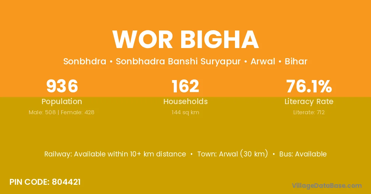 Arwal (30 km) is the nearest town to Wor Bigha village for major economic activities and is located approximately 30 km away.
