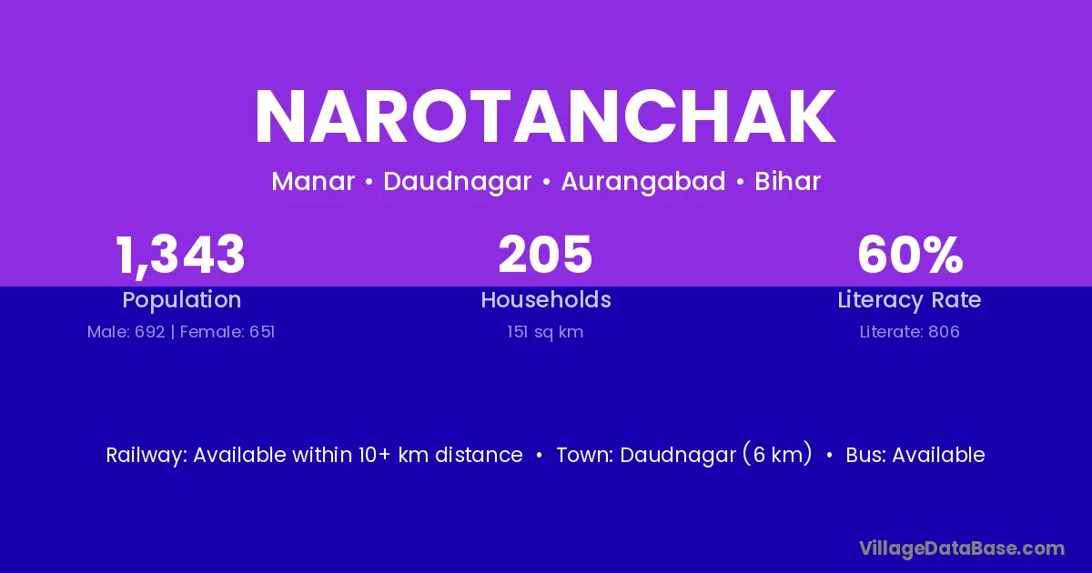 Daudnagar (6 km) is the nearest town to Narotanchak village for major economic activities and is located approximately 6 km away.