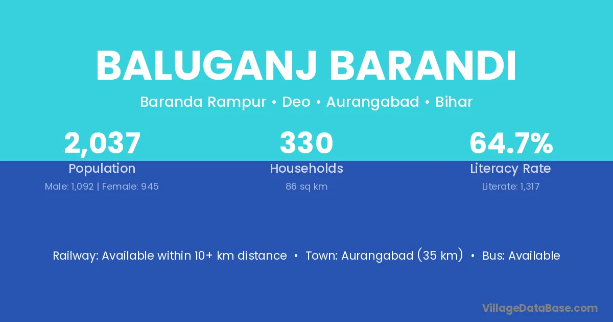 Aurangabad (35 km) is the nearest town to Baluganj Barandi village for major economic activities and is located approximately 35 km away.