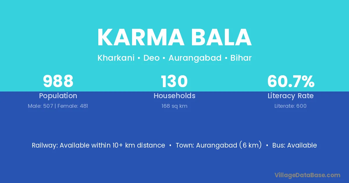 Karma Bala village has a total population of 988 people, of which 507 are males and 481 are females.