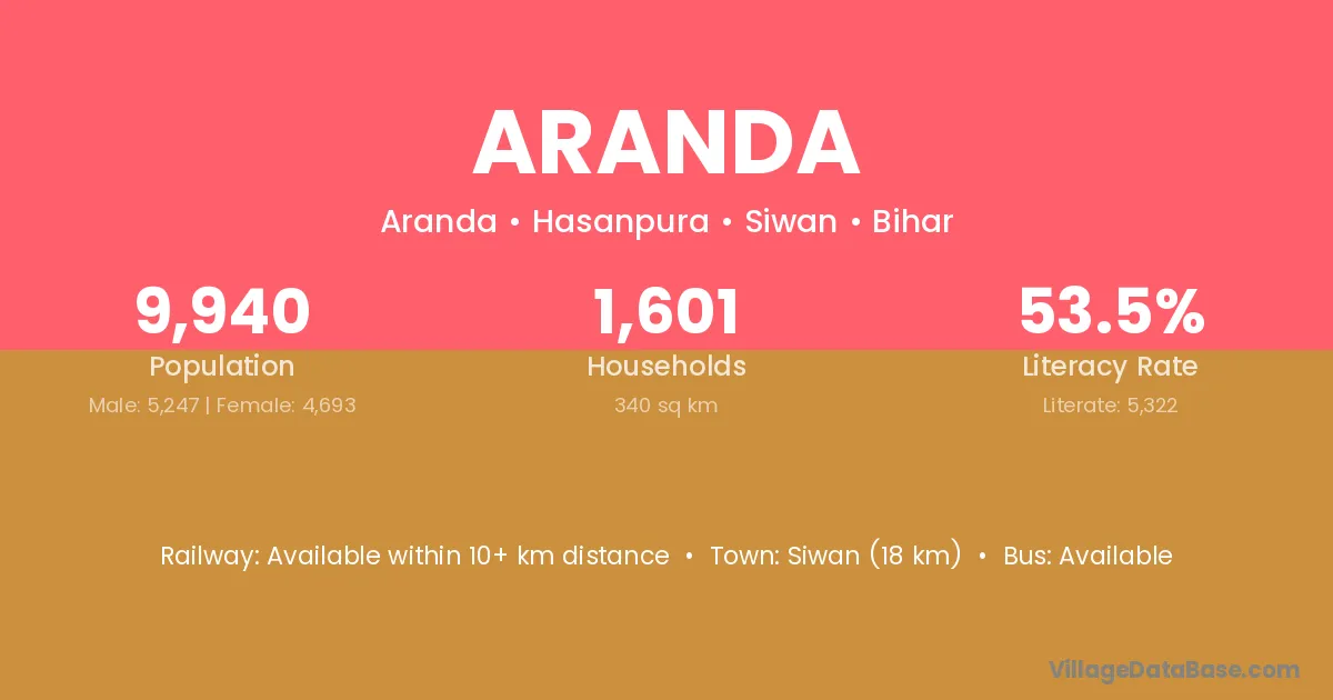 The literacy rate of Aranda village is 53.64%. Male literacy stands at 60.21% and female literacy at 46.50%.