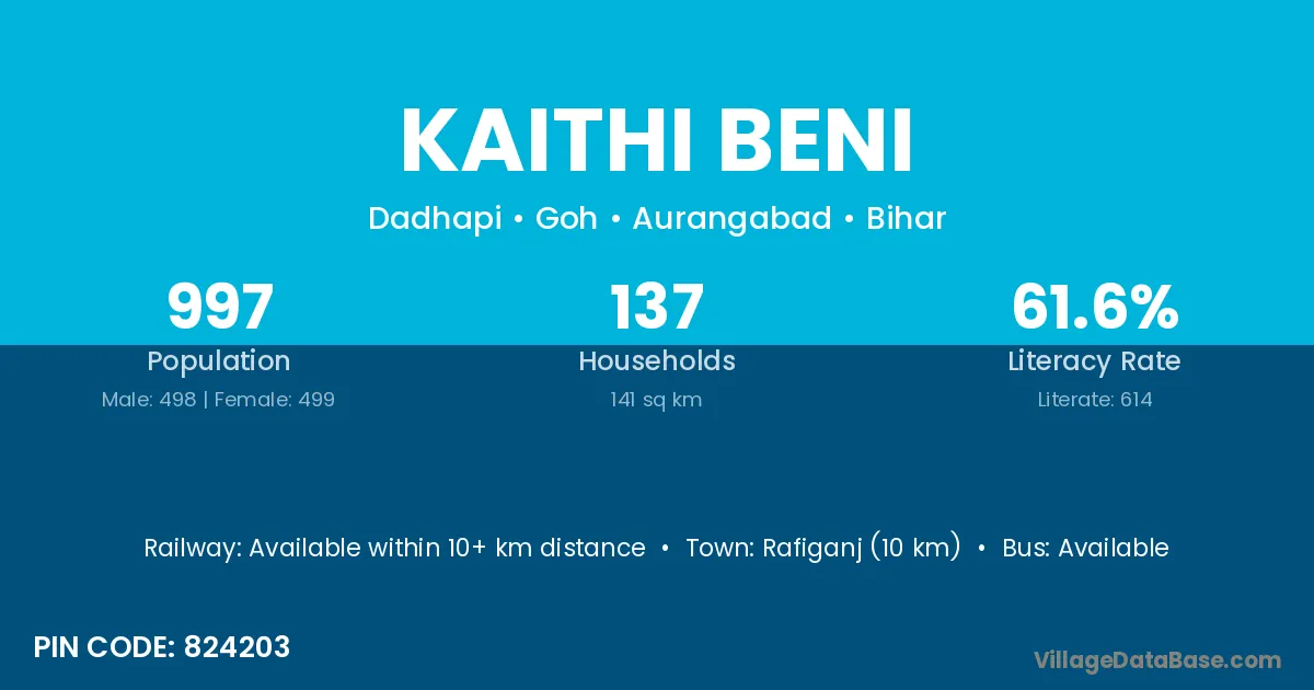 Kaithi Beni village has a total population of 997 people, of which 498 are males and 499 are females.