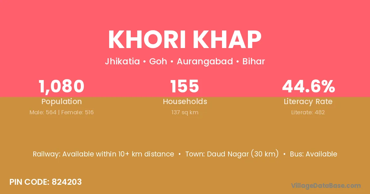 Khori Khap village has a total population of 1,080 people, of which 564 are males and 516 are females.