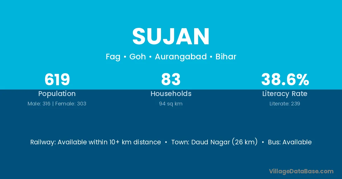 Daud Nagar (26 km) is the nearest town to Sujan village for major economic activities and is located approximately 26 km away.