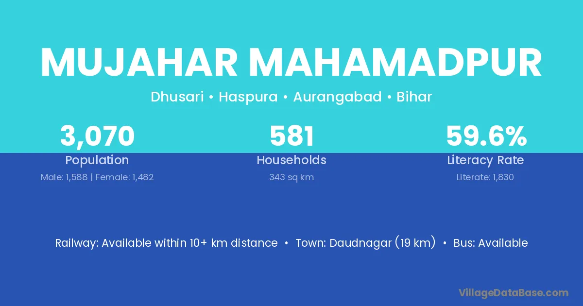 Daudnagar (19 km) is the nearest town to Mujahar Mahamadpur village for major economic activities and is located approximately 19 km away.