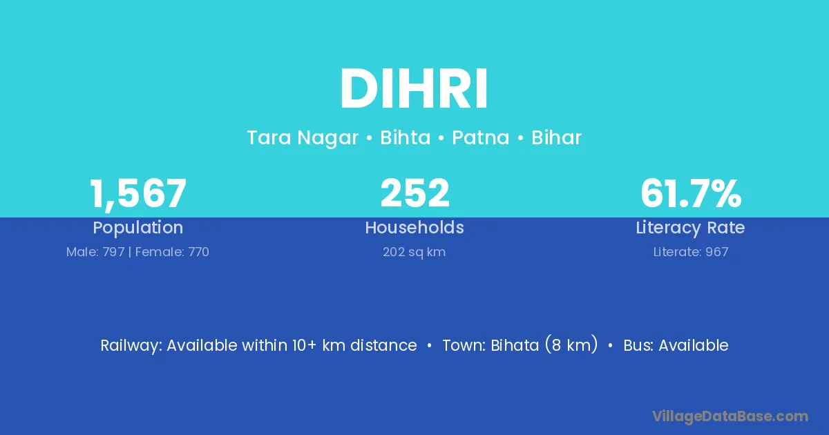 Aurangabad (22 km) is the nearest town to Dihri village for major economic activities and is located approximately 22 km away.