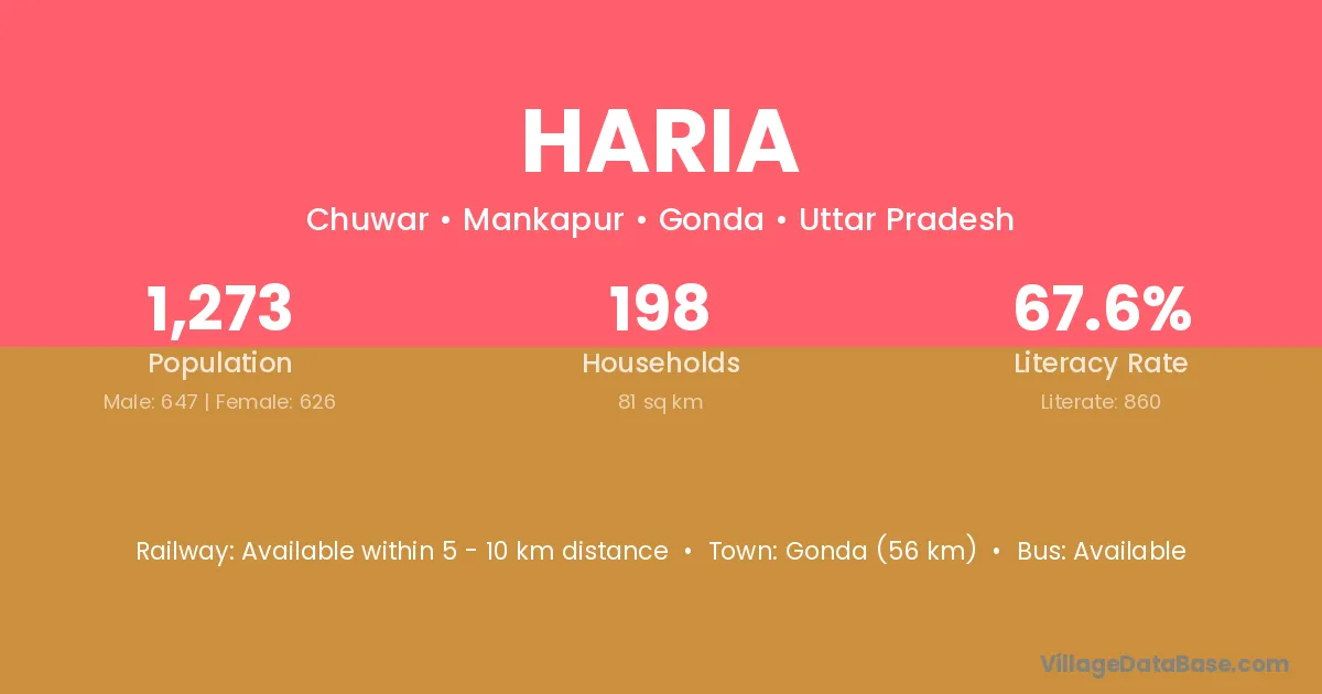 The literacy rate of Haria village is 64.02%. Male literacy stands at 70.90% and female literacy at 56.45%.