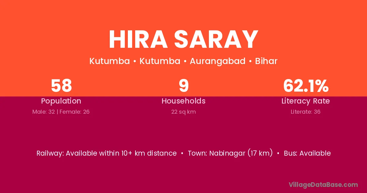 Nabinagar (17 km) is the nearest town to Hira Saray village for major economic activities and is located approximately 17 km away.