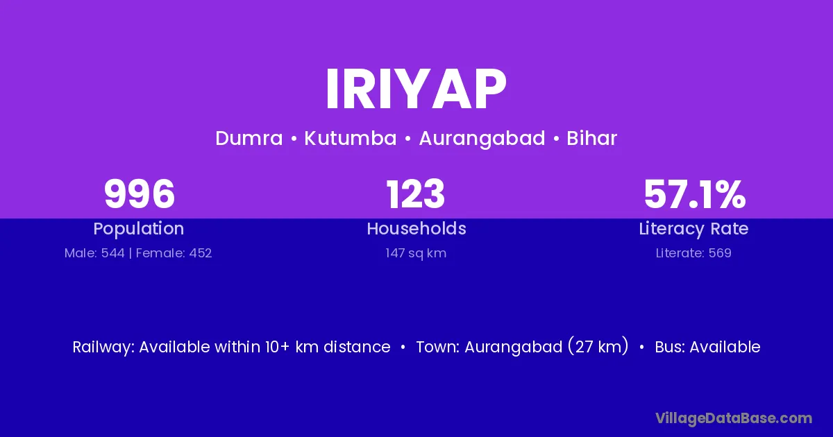 Aurangabad (27 km) is the nearest town to Iriyap village for major economic activities and is located approximately 27 km away.