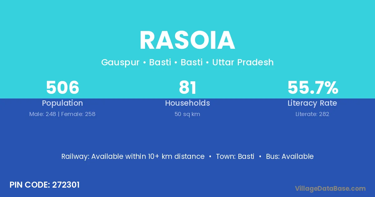 The literacy rate of Rasoia village is 72.35%. Male literacy stands at 80.77% and female literacy at 63.64%.