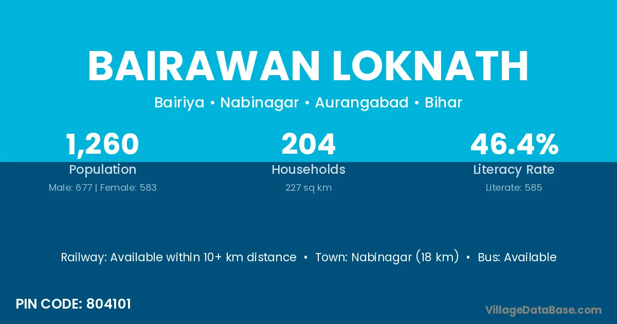 Nabinagar (18 km) is the nearest town to Bairawan Loknath village for major economic activities and is located approximately 18 km away.