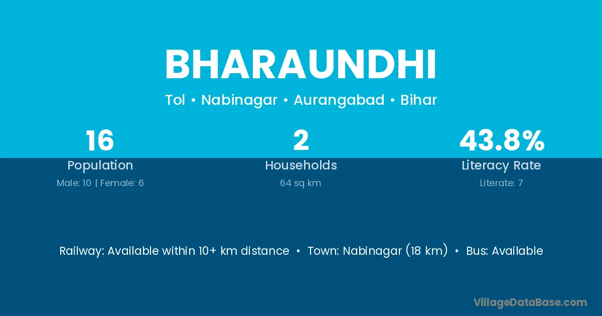 Nabinagar (18 km) is the nearest town to Bharaundhi village for major economic activities and is located approximately 18 km away.
