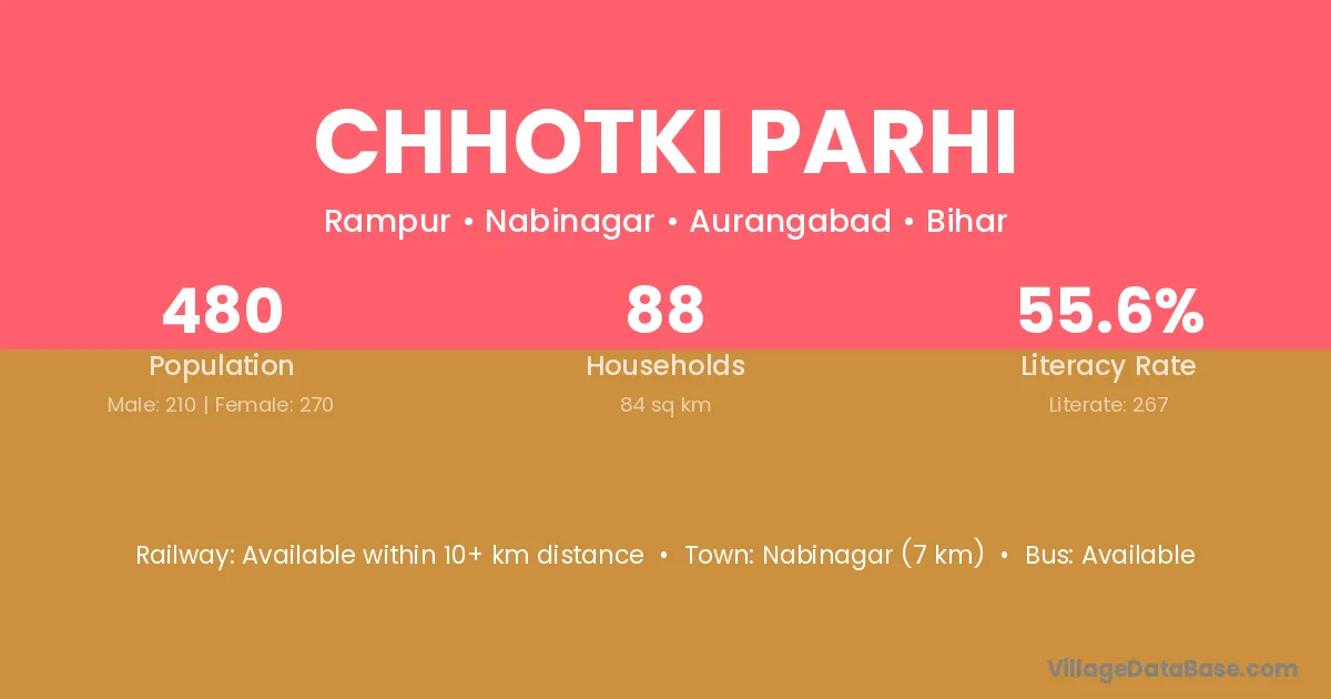 Nabinagar (7 km) is the nearest town to Chhotki Parhi village for major economic activities and is located approximately 7 km away.