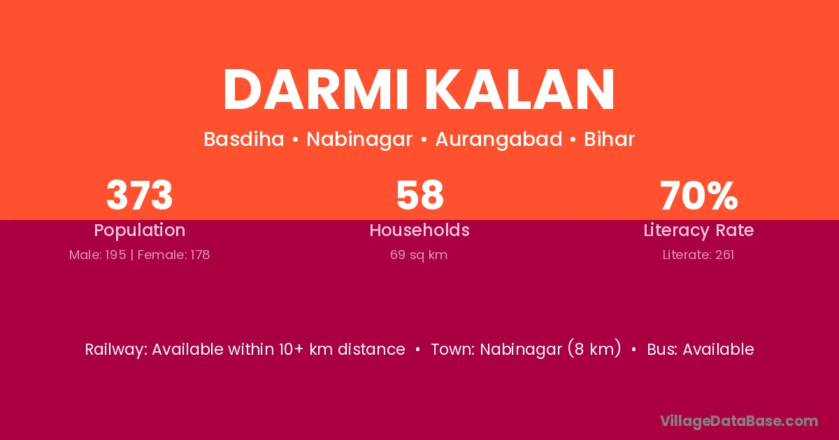 Nabinagar (8 km) is the nearest town to Darmi Kalan village for major economic activities and is located approximately 8 km away.