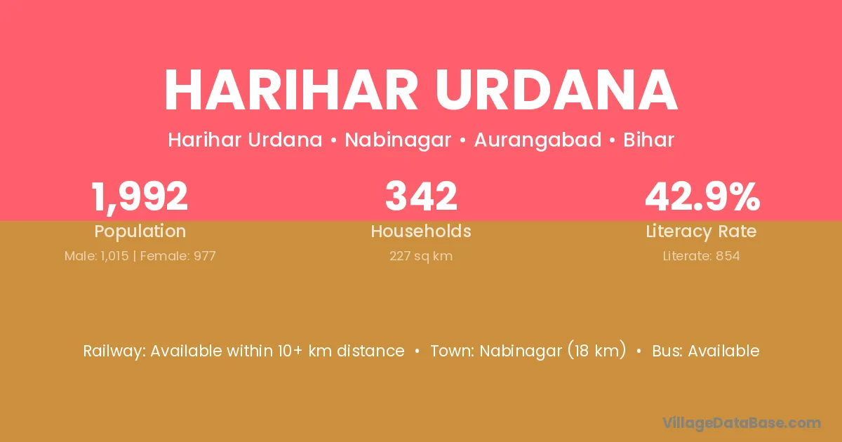 Nabinagar (18 km) is the nearest town to Harihar Urdana village for major economic activities and is located approximately 18 km away.