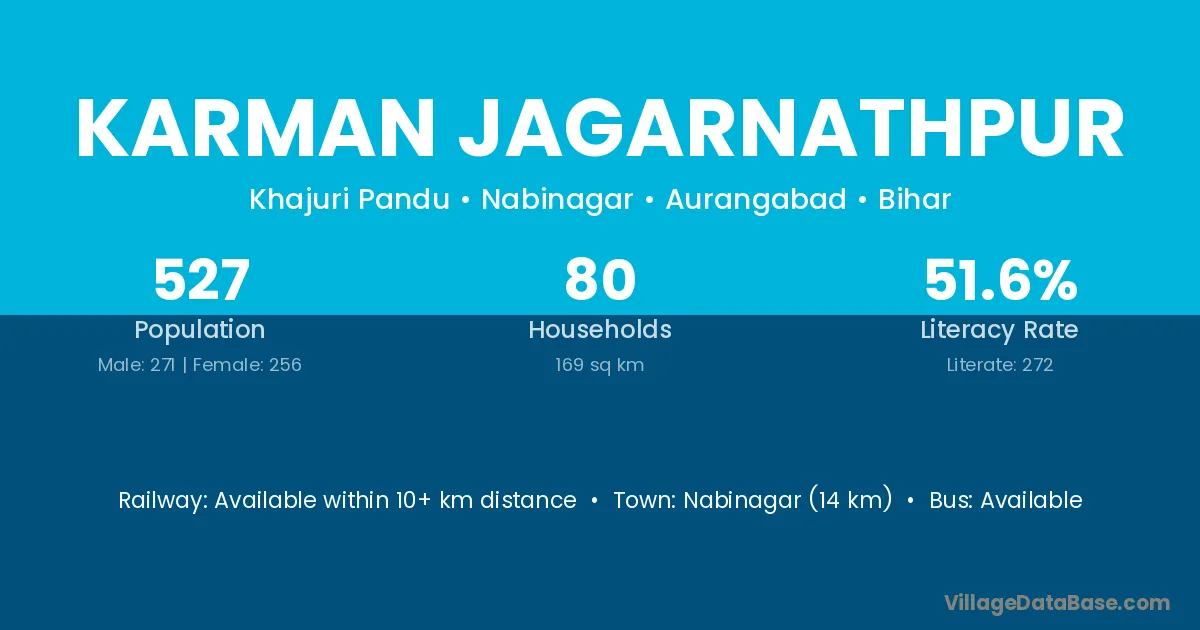Nabinagar (14 km) is the nearest town to Karman Jagarnathpur village for major economic activities and is located approximately 14 km away.