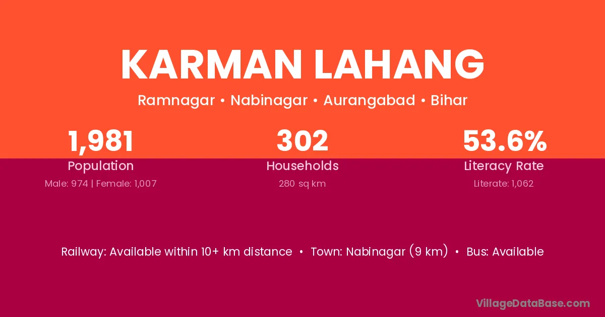 Nabinagar (9 km) is the nearest town to Karman Lahang village for major economic activities and is located approximately 9 km away.