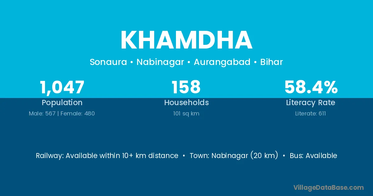 Nabinagar (20 km) is the nearest town to Khamdha village for major economic activities and is located approximately 20 km away.