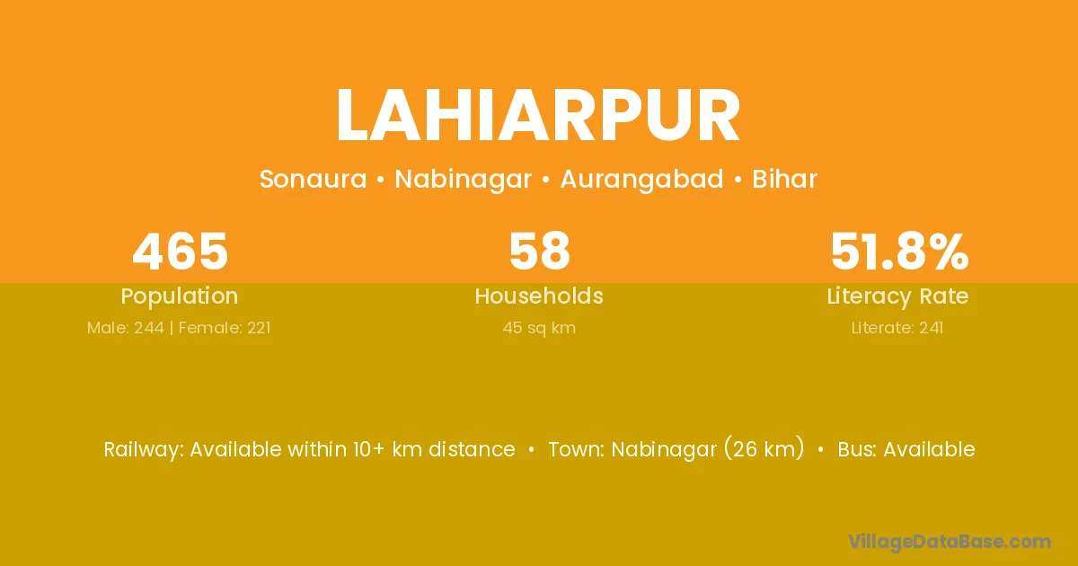 Lahiarpur village has a total population of 465 people, of which 244 are males and 221 are females.
