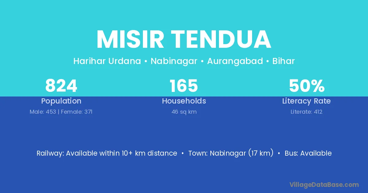 Nabinagar (17 km) is the nearest town to Misir Tendua village for major economic activities and is located approximately 17 km away.