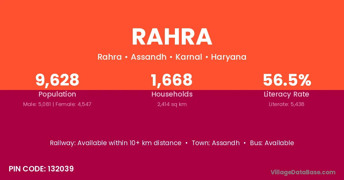 The literacy rate of Rahra village is 59.42%. Male literacy stands at 65.56% and female literacy at 52.61%.