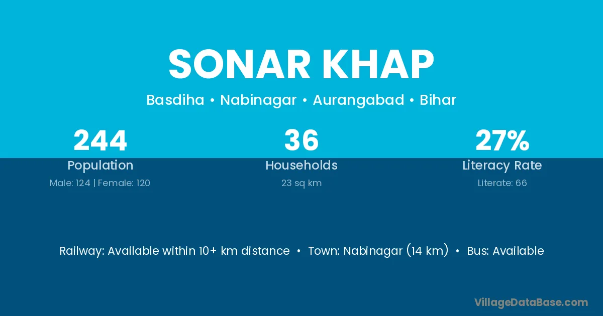 Nabinagar (14 km) is the nearest town to Sonar Khap village for major economic activities and is located approximately 14 km away.