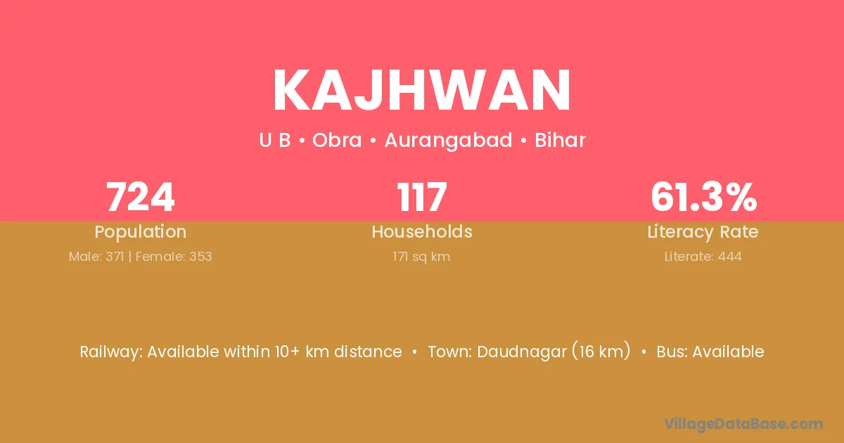 Daudnagar (16 km) is the nearest town to Kajhwan village for major economic activities and is located approximately 16 km away.