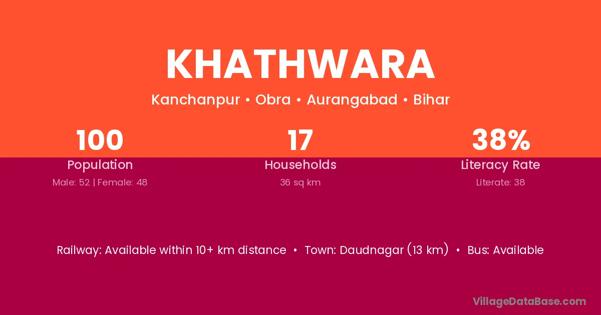 Daudnagar (13 km) is the nearest town to Khathwara village for major economic activities and is located approximately 13 km away.
