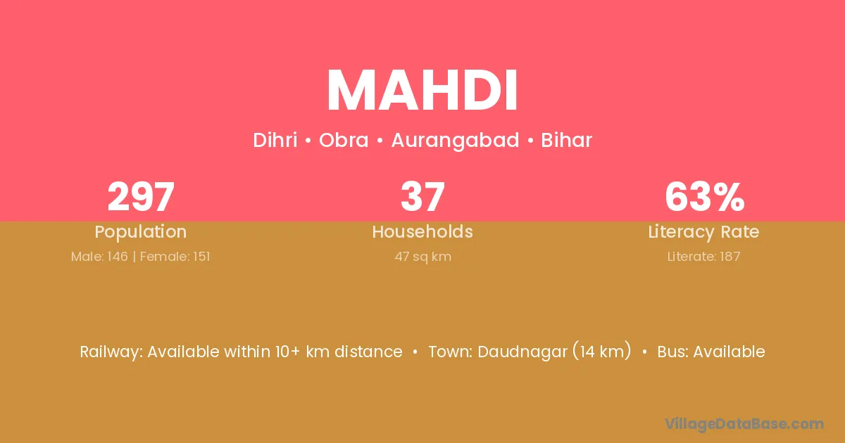 Daudnagar (14 km) is the nearest town to Mahdi village for major economic activities and is located approximately 14 km away.