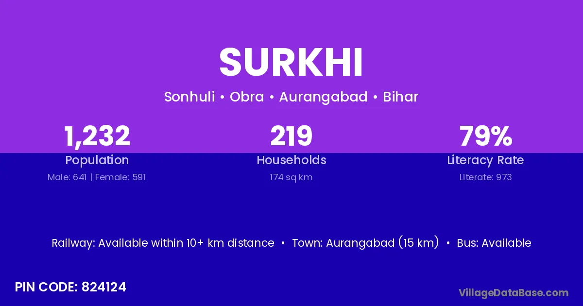 Aurangabad (15 km) is the nearest town to Surkhi village for major economic activities and is located approximately 15 km away.