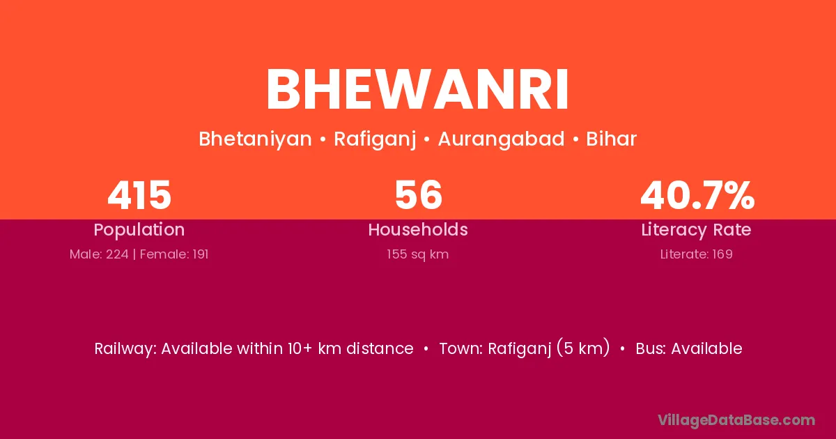 Bhewanri village has a total population of 415 people, of which 224 are males and 191 are females.
