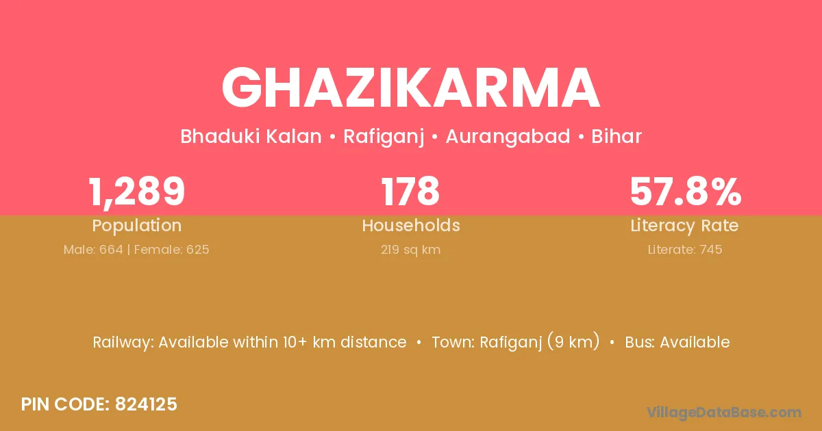 Ghazikarma village has a total population of 1,289 people, of which 664 are males and 625 are females.
