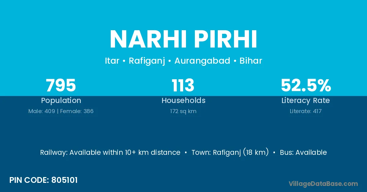 Rafiganj (18 km) is the nearest town to Narhi Pirhi village for major economic activities and is located approximately 18 km away.