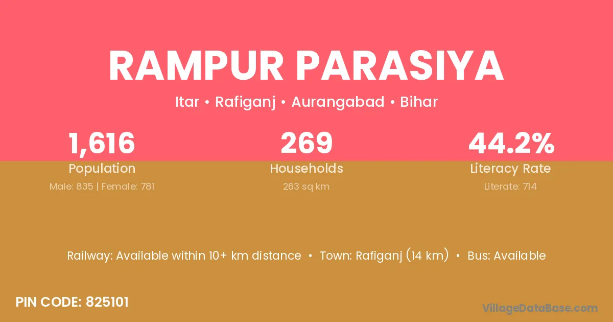 Rafiganj (14 km) is the nearest town to Rampur Parasiya village for major economic activities and is located approximately 14 km away.