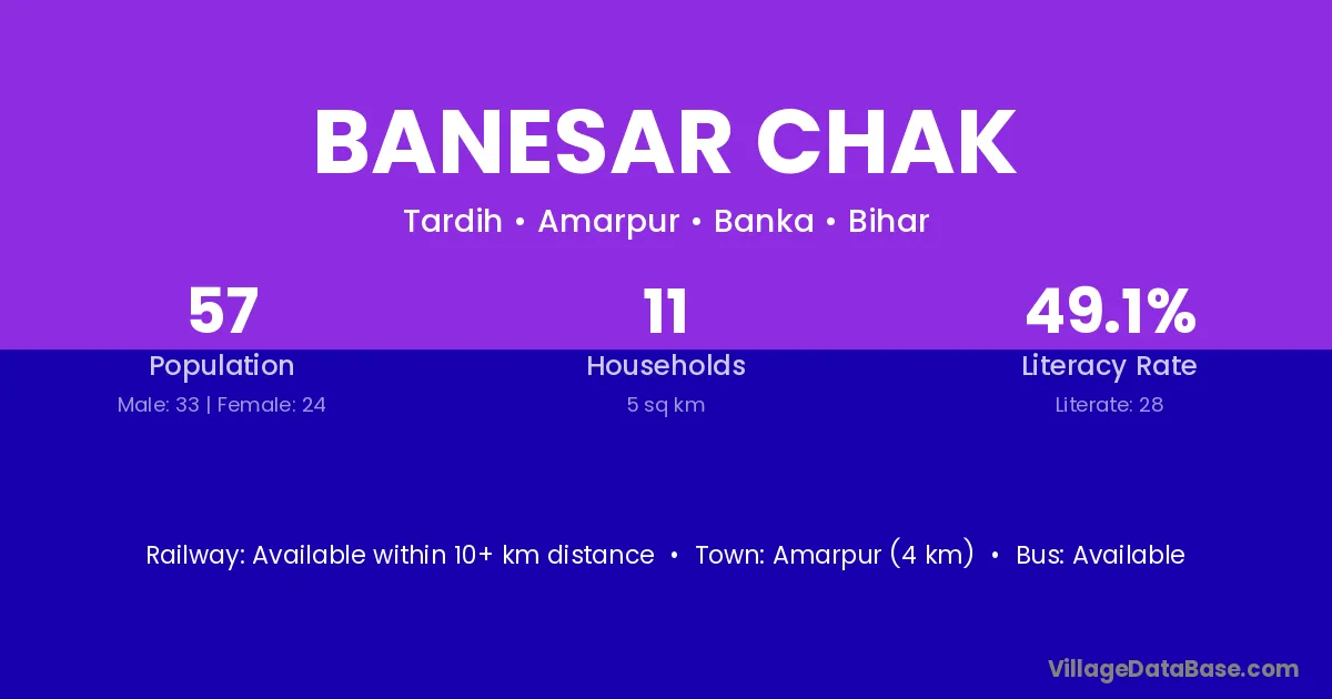 Banesar Chak village has a total population of 57 people, of which 33 are males and 24 are females.