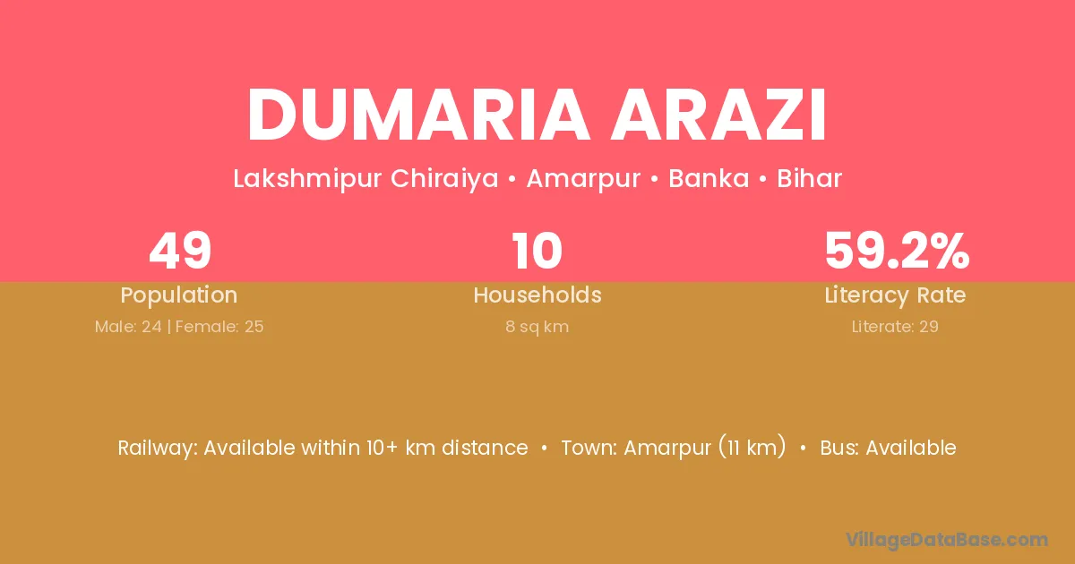 Dumaria Arazi village has a total population of 49 people, of which 24 are males and 25 are females.