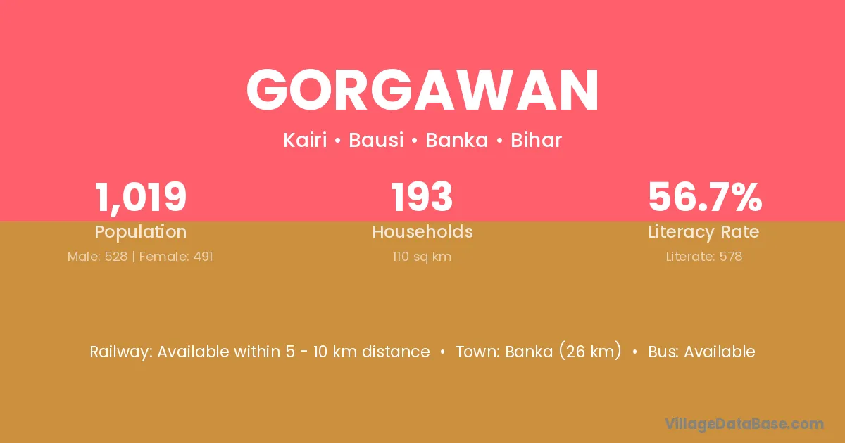 The literacy rate of Gorgawan village is 54.24%. Male literacy stands at 60.76% and female literacy at 46.74%.