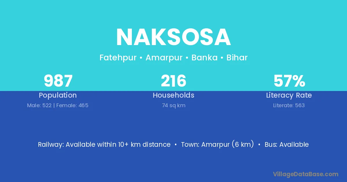 Naksosa village has a total population of 987 people, of which 522 are males and 465 are females.