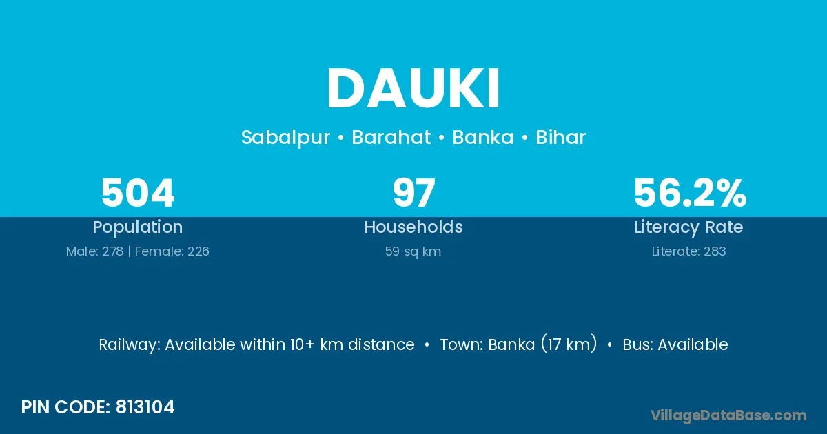 Banka (17 km) is the nearest town to Dauki village for major economic activities and is located approximately 17 km away.