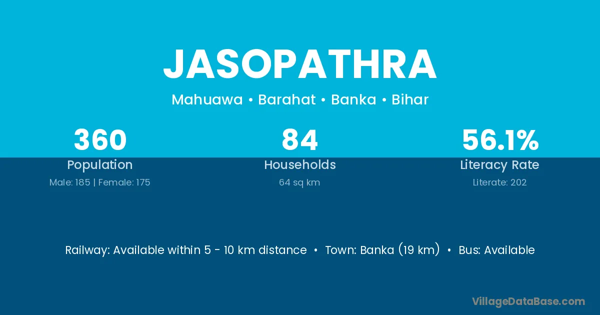 Banka (19 km) is the nearest town to Jasopathra village for major economic activities and is located approximately 19 km away.