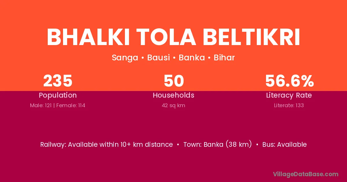 Banka (38 km) is the nearest town to Bhalki Tola Beltikri village for major economic activities and is located approximately 38 km away.