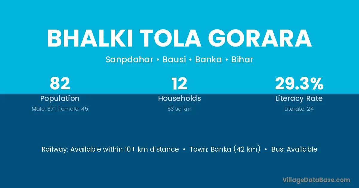 Banka (42 km) is the nearest town to Bhalki Tola Gorara village for major economic activities and is located approximately 42 km away.