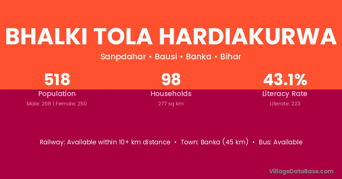 Banka (45 km) is the nearest town to Bhalki Tola Hardiakurwa village for major economic activities and is located approximately 45 km away.