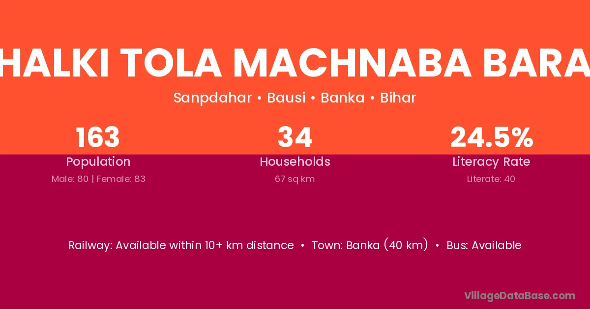 Banka (40 km) is the nearest town to Bhalki Tola Machnaba Baran village for major economic activities and is located approximately 40 km away.