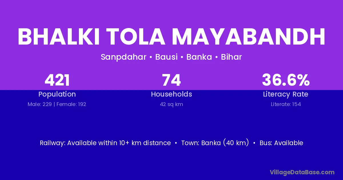 Bhalki Tola Mayabandh village has a total population of 421 people, of which 229 are males and 192 are females.