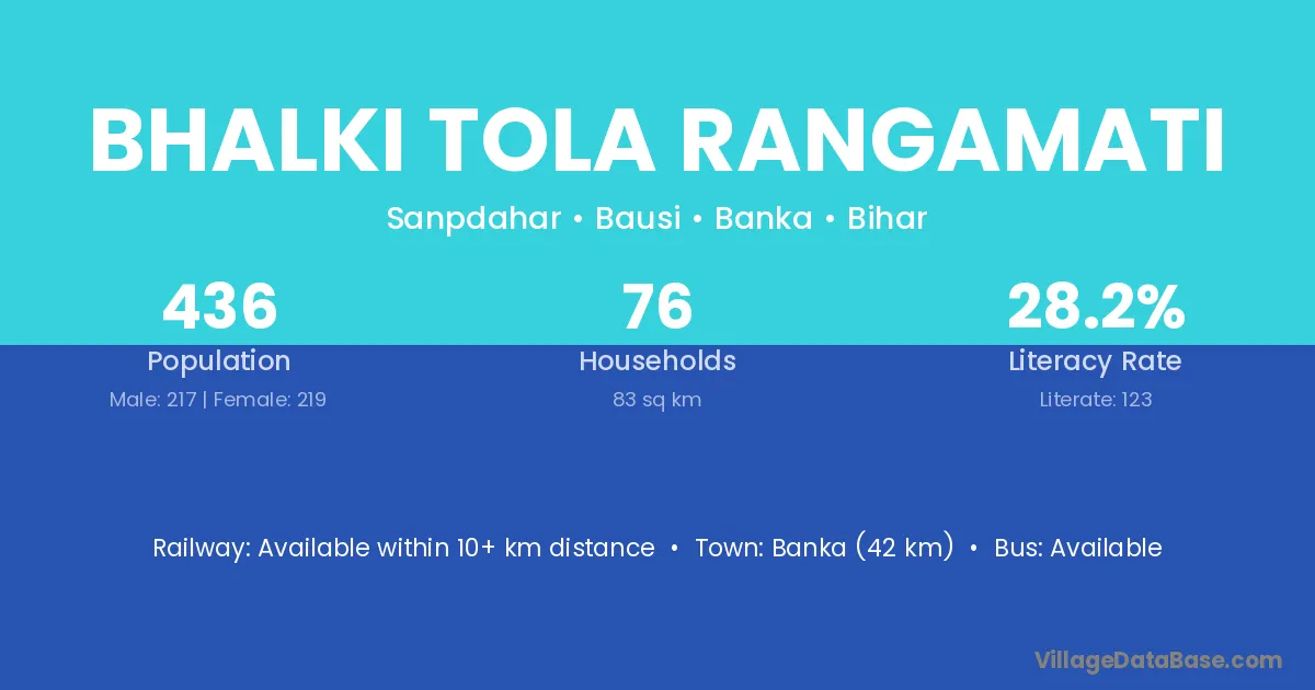 Bhalki Tola Rangamati village has a total population of 436 people, of which 217 are males and 219 are females.