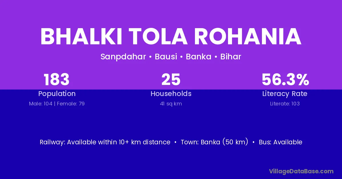 Bhalki Tola Rohania village has a total population of 183 people, of which 104 are males and 79 are females.