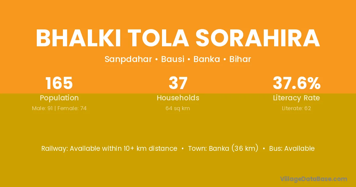 Banka (36 km) is the nearest town to Bhalki Tola Sorahira village for major economic activities and is located approximately 36 km away.