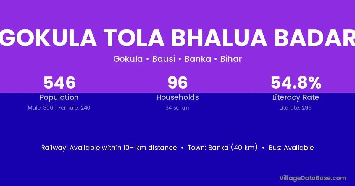 Banka (40 km) is the nearest town to Gokula Tola Bhalua Badar village for major economic activities and is located approximately 40 km away.